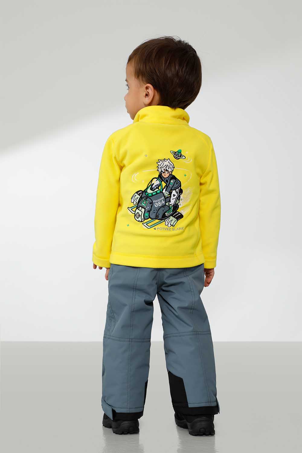 Big back embroidery of Snow-Space Scooter. Satiny piping in tonal color at front zipper.
