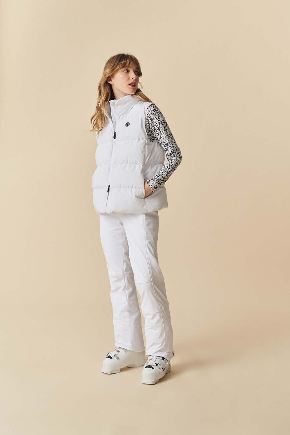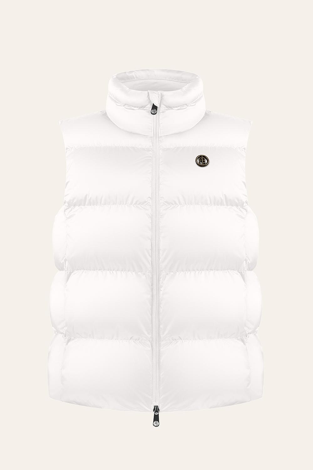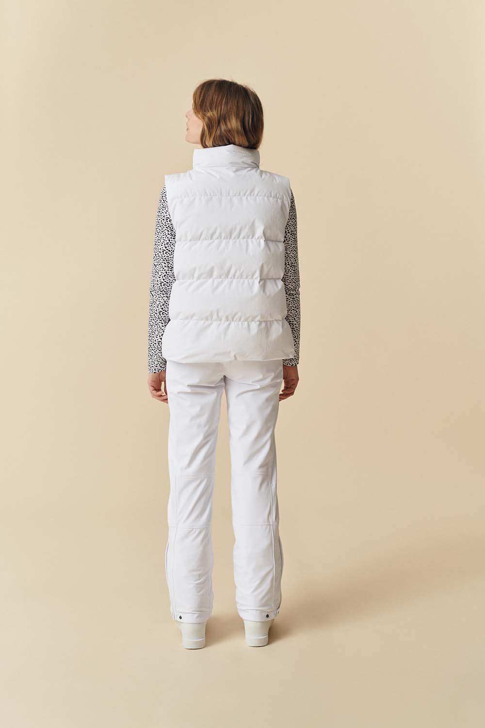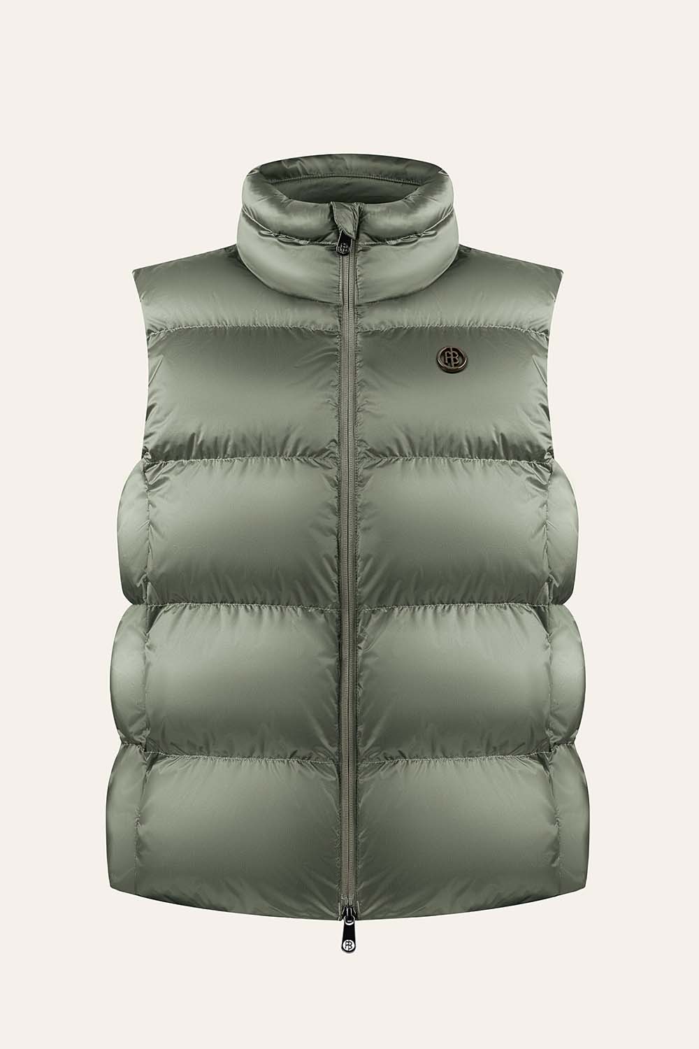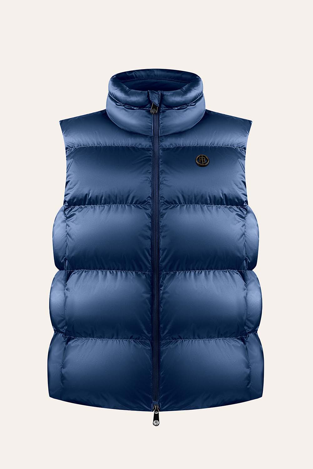 The Camila sleeveless down jacket is designed in an iridescent, matte or printed fabric.