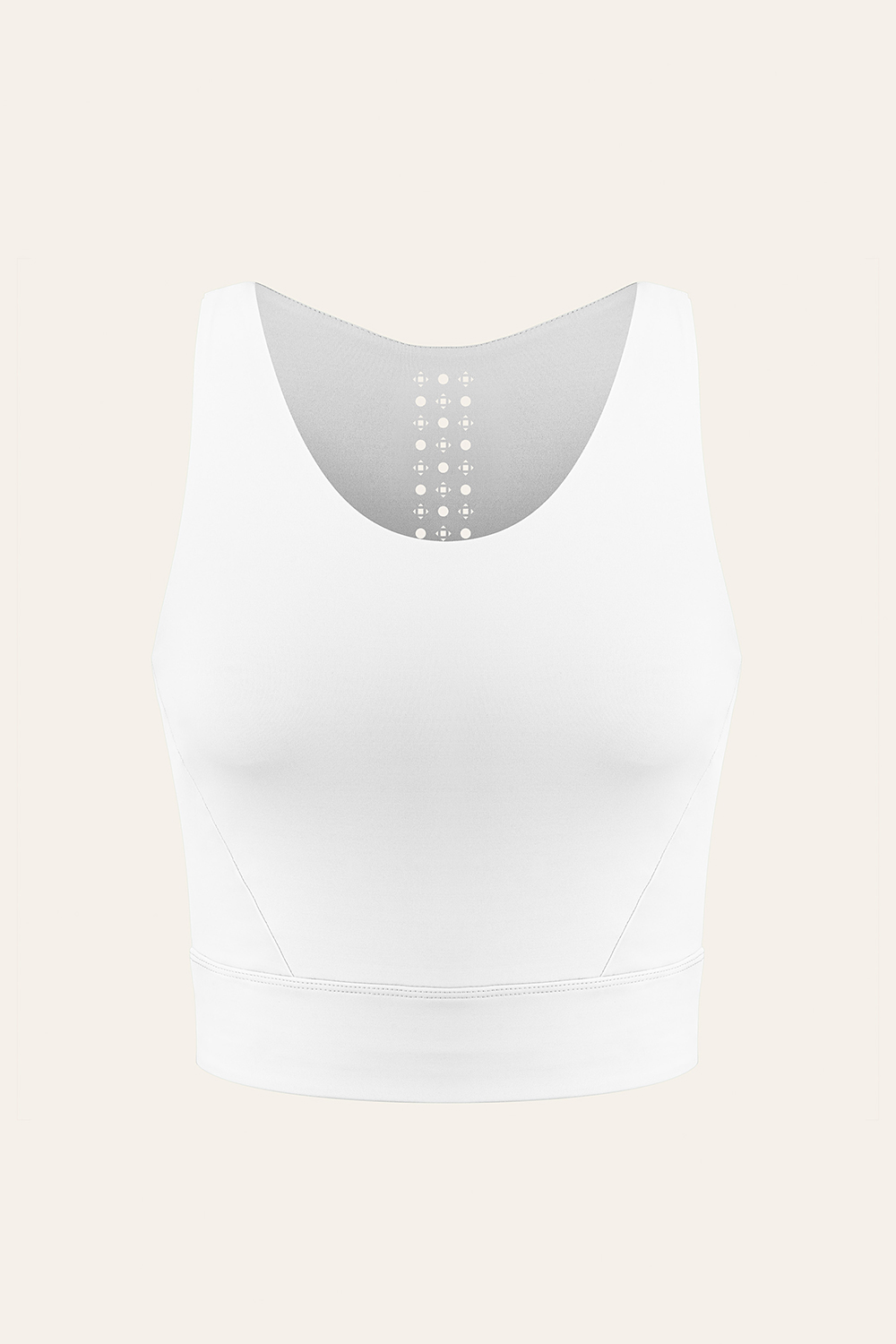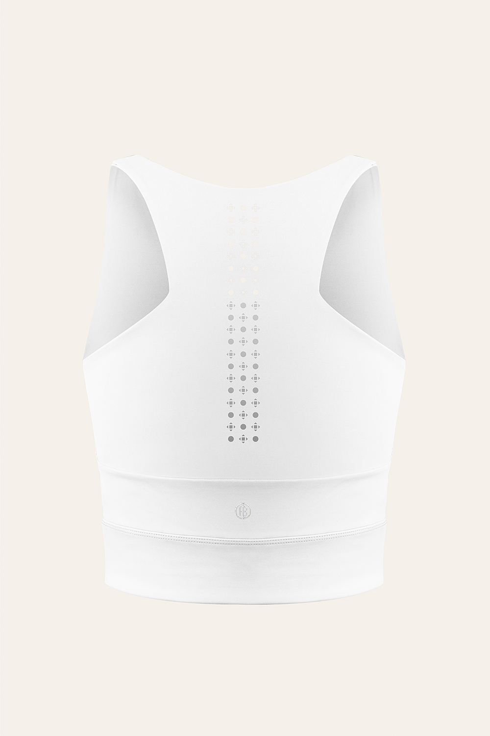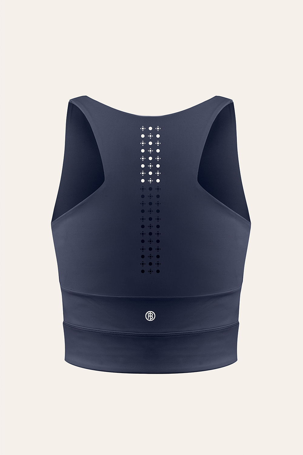 This sports bra can also be worn as a crop top thanks to its longer cut, which gently supports and slims the waist. The use of this new breathable, incredibly soft, four-way stretch fabric provides a perfect fit. It can be worn in any situation, whether for sports or under a t-shirt during the day.
