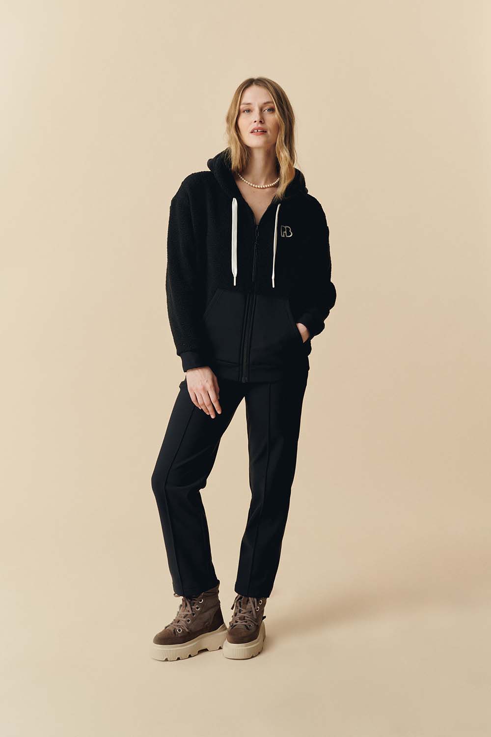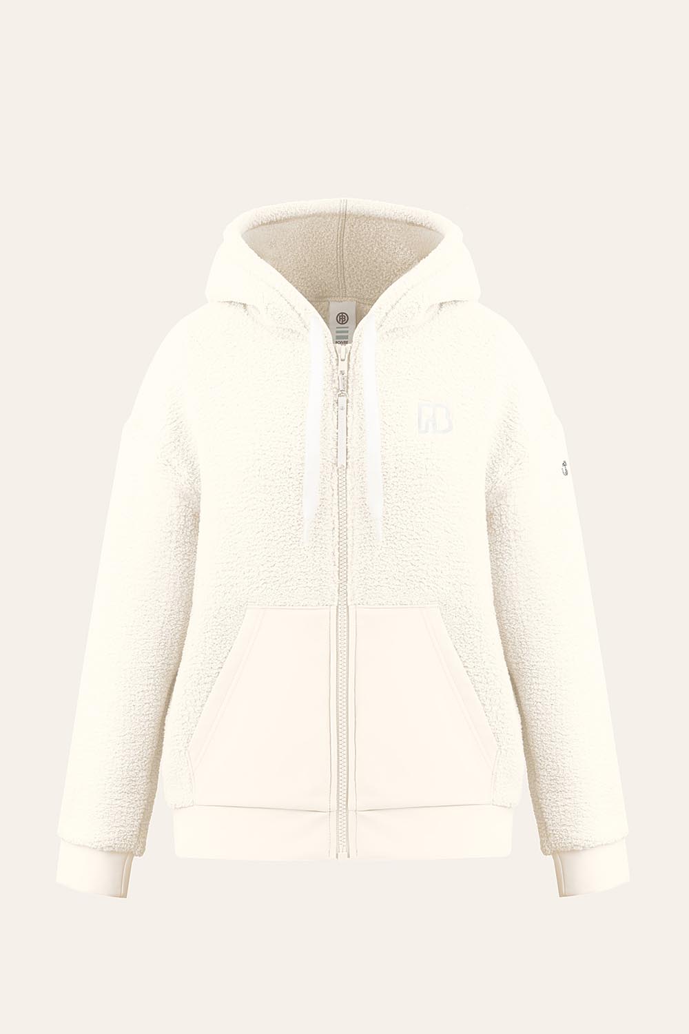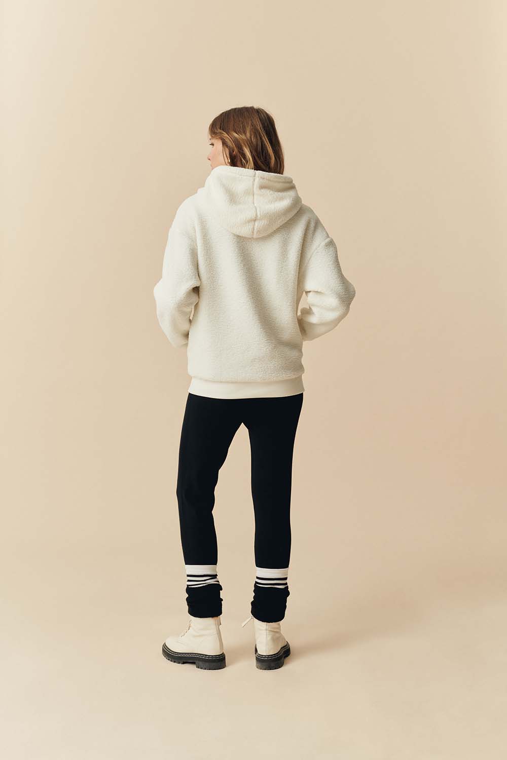 The Ninon hooded jacket designed in sherpa fleece mixed with neoprene fabric details offers a casual oversized look.