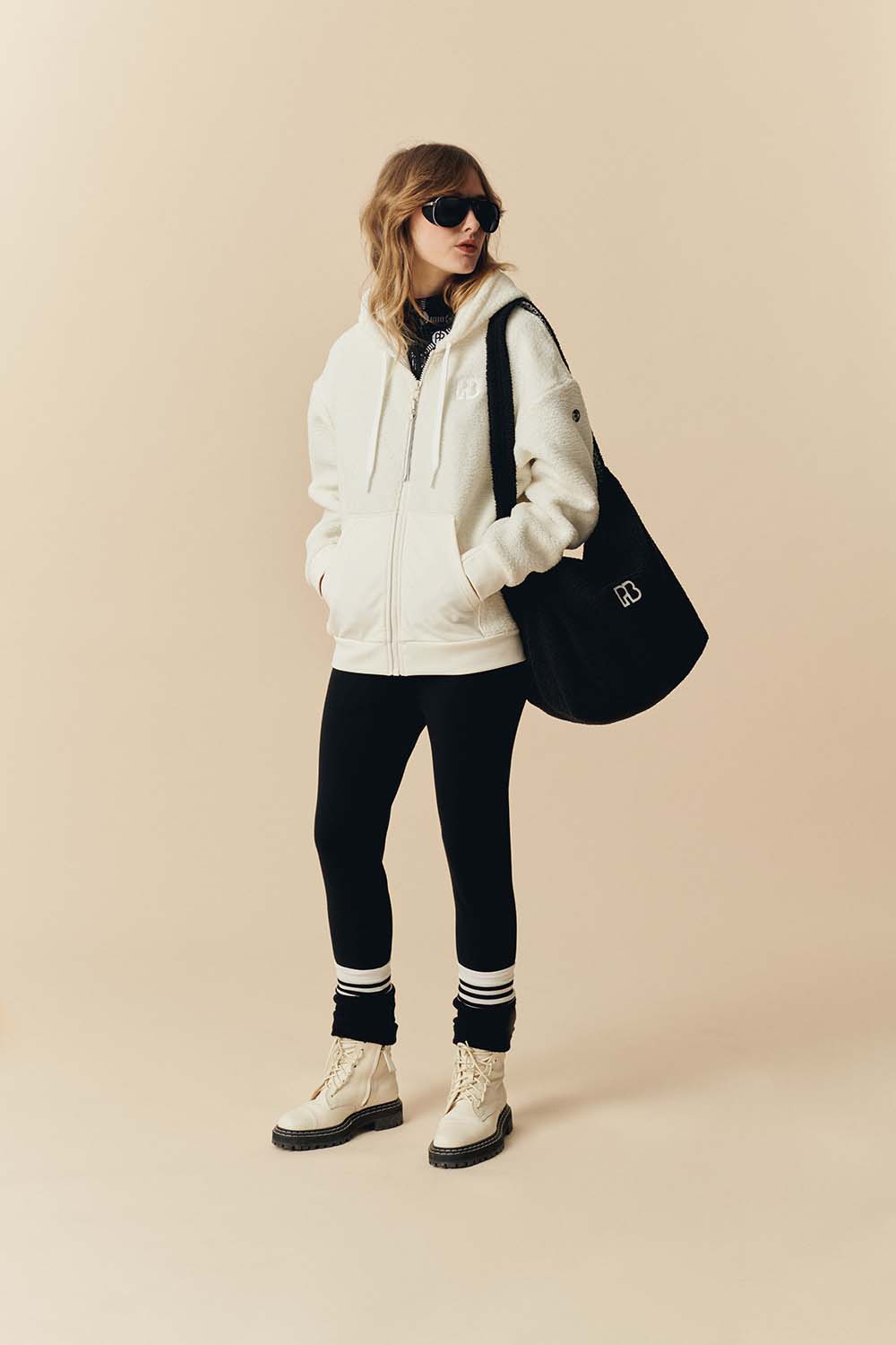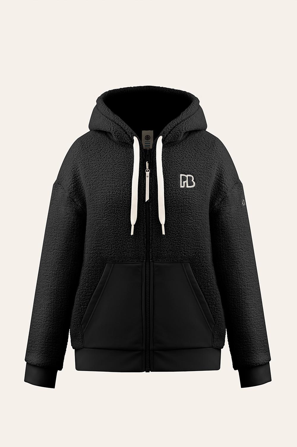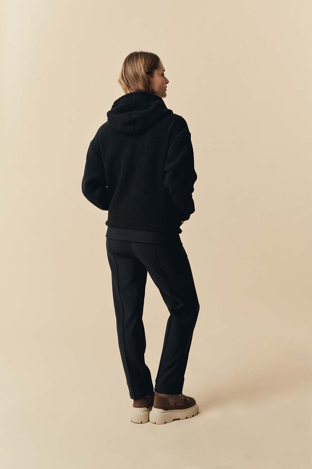 The Ninon hooded jacket designed in sherpa fleece mixed with neoprene fabric details offers a casual oversized look.