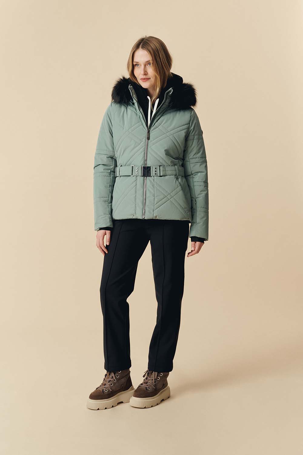 The Joana straight cut ski jacket is available in an iridescent fabric in a quilted or printed version.