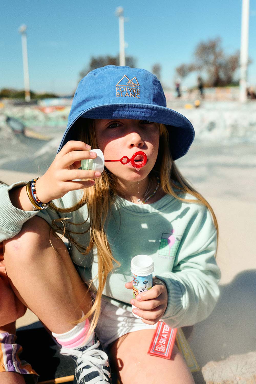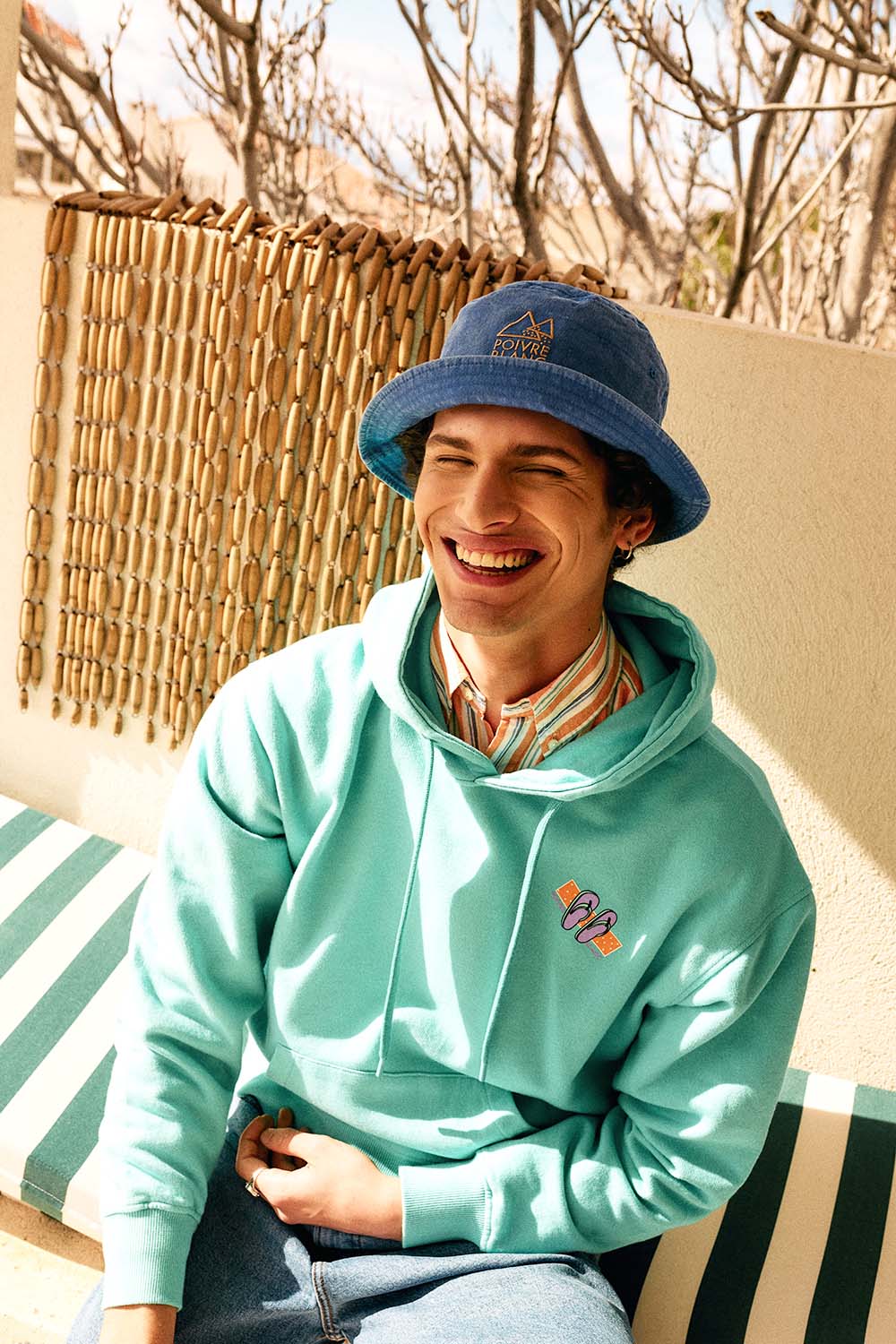 Bob en tissu lavé avec large bordure, coutures apparentes et logo