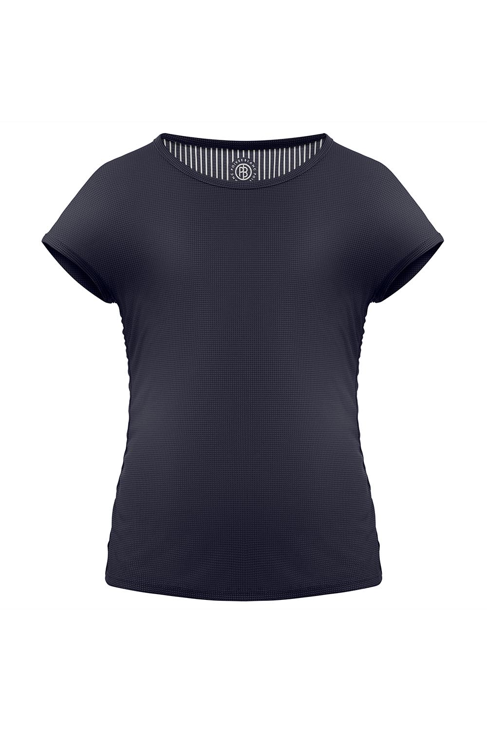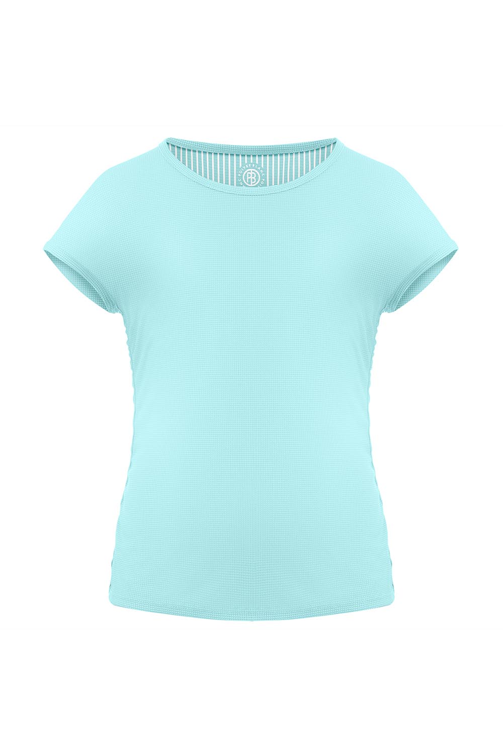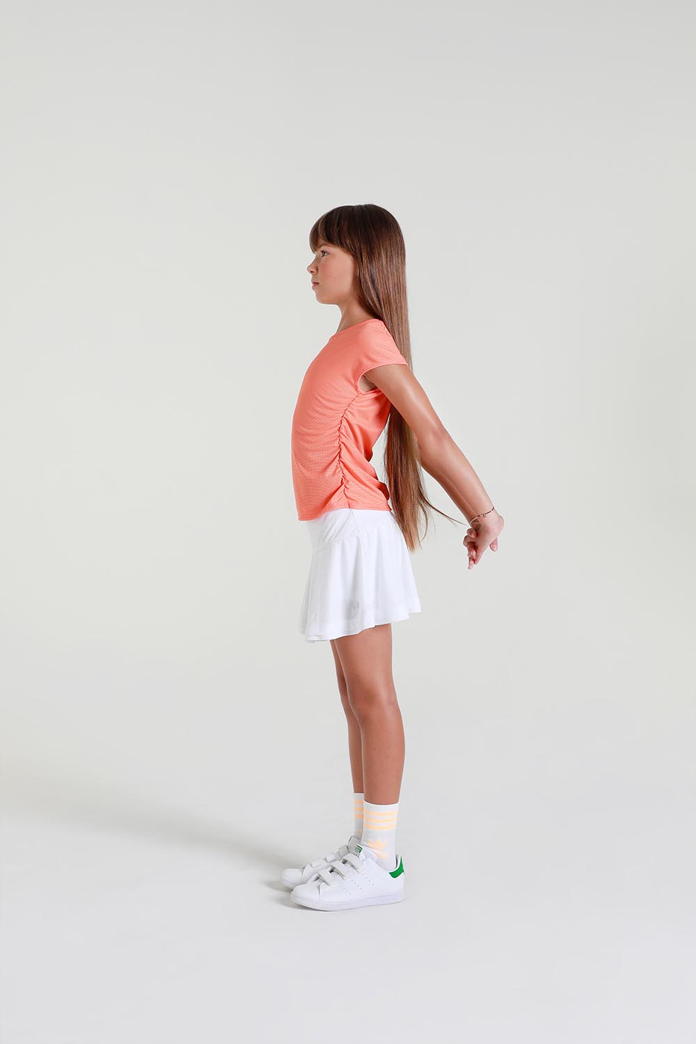 Tee-shirt ras du cou, couture latérale élastiquée pour tenue froncée. Tissu 100 % polyester recyclé séchage rapide, antimicrobien, facile d’entretien