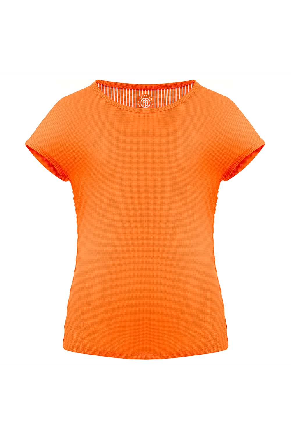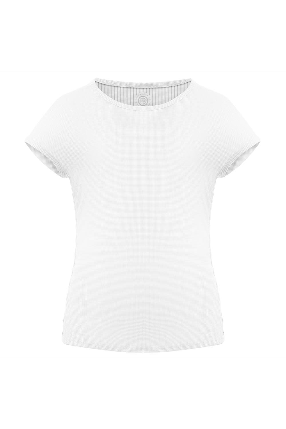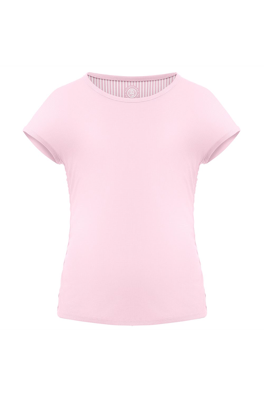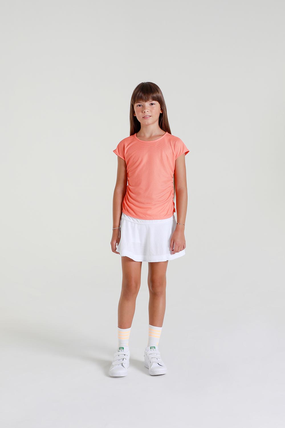 Tee-shirt ras du cou, couture latérale élastiquée pour tenue froncée. Tissu 100 % polyester recyclé séchage rapide, antimicrobien, facile d’entretien